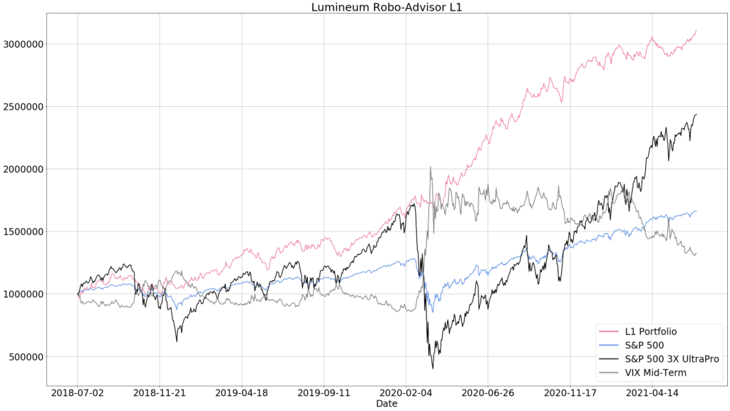 두번째 백테스트 화면은 L1-00의 투자유니버스에 함께 들어 있는 S&P 3X 레버리지 ETF와 공포지수 ETF를 함께 포함시켜 어떻게 해서 L1 포트폴리오가 이런 성과를 내는지 설명해 주고 있습니다.