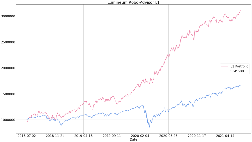 L1-00은 기능제한 없는 연구용 초기 버전이며 아래와 같이 S&P 500을 이익률과 저변동성에서 크게 앞서는 백테스트 결과를 보여 주었습니다.